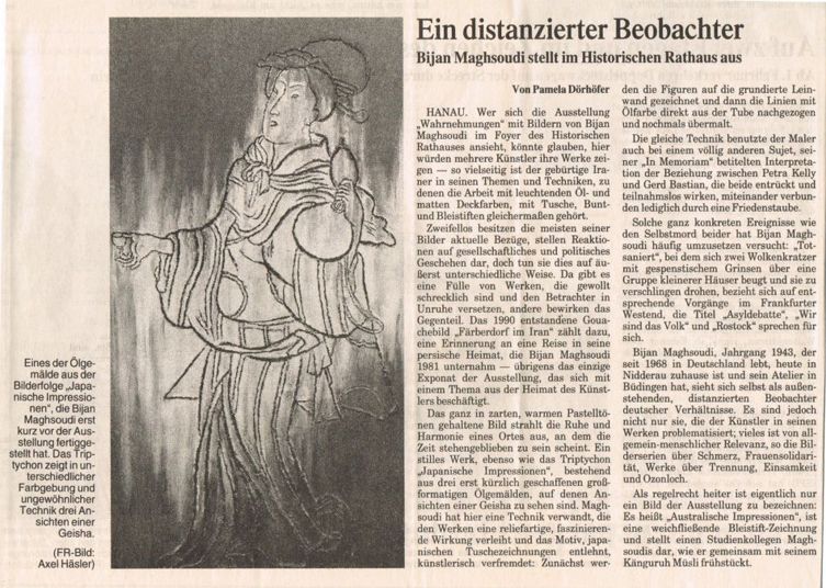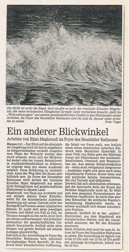 Dieser Bericht vom 13. 1. 1995 aus der FRANKFURTER RUNDSCHAU Nr. 11 Seite V befasst sich mit der Ausstellung "WAHRNEHMUNGEN", die im Neustädter Rathaus in Hanau stattfand. Ebenso der folgende Zeitungsartikel gleichen Datums aus dem HANAUER ANZEIGER Nr.11, Seite 9